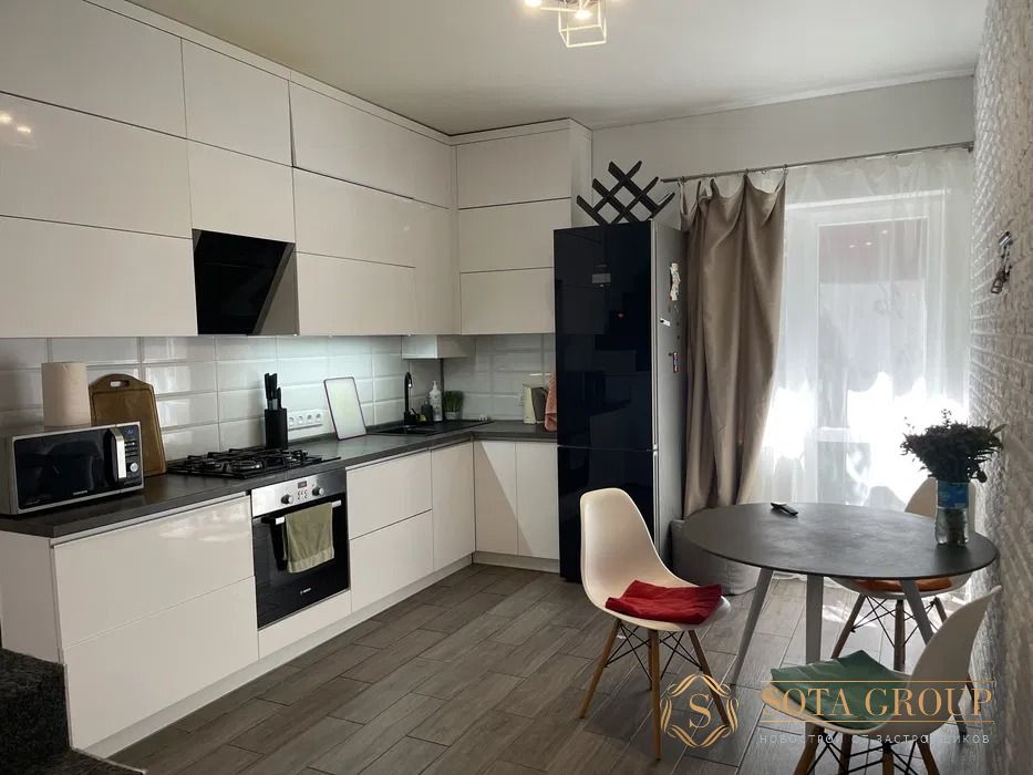 На первом этаже : большая просторная кухня, санузел, прихожая и маленький дворик с кухней, для барбекю
